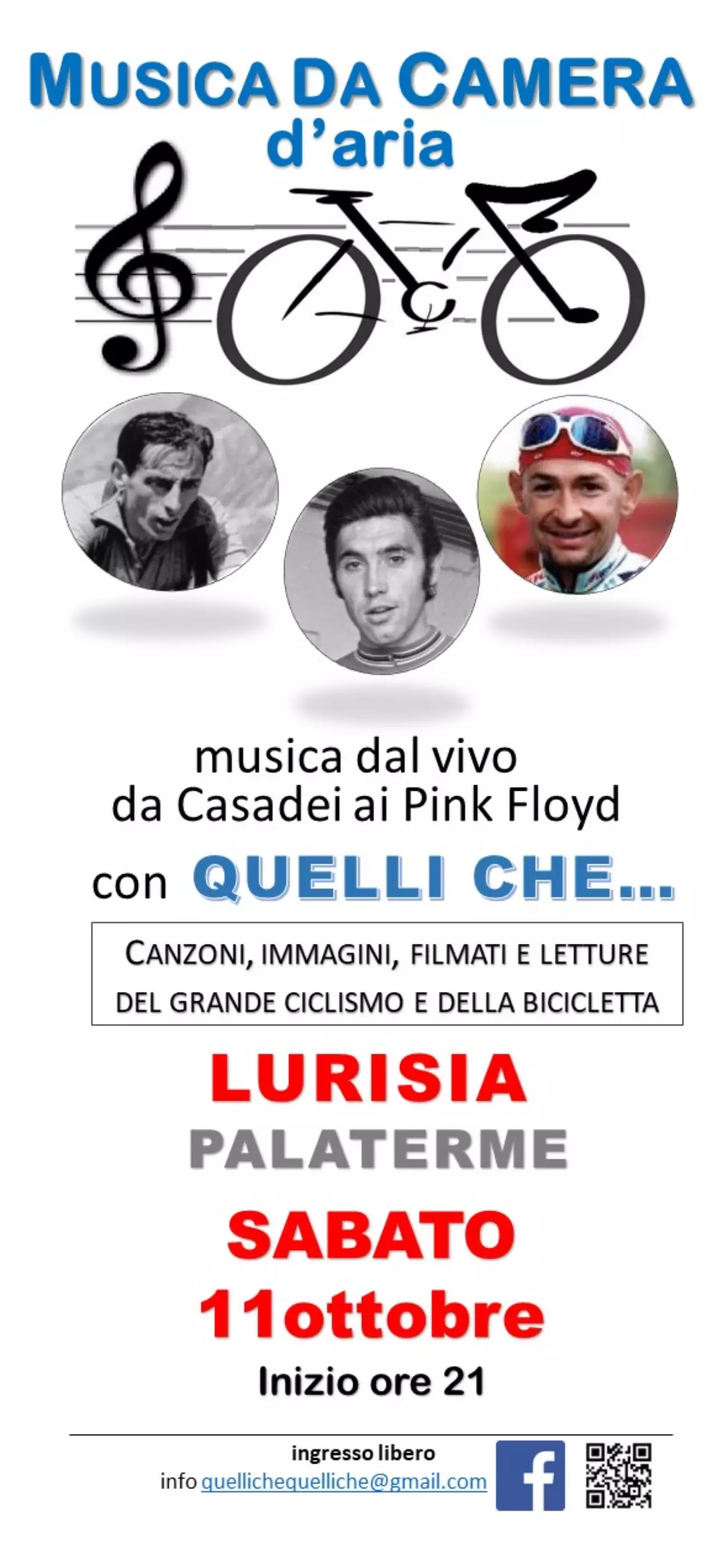 A seguire spettacolo musicale con “Musica da Camera d’Aria”, un emozionante viaggio tra canzoni, immagini e racconti sul grande ciclismo e la bicicletta.